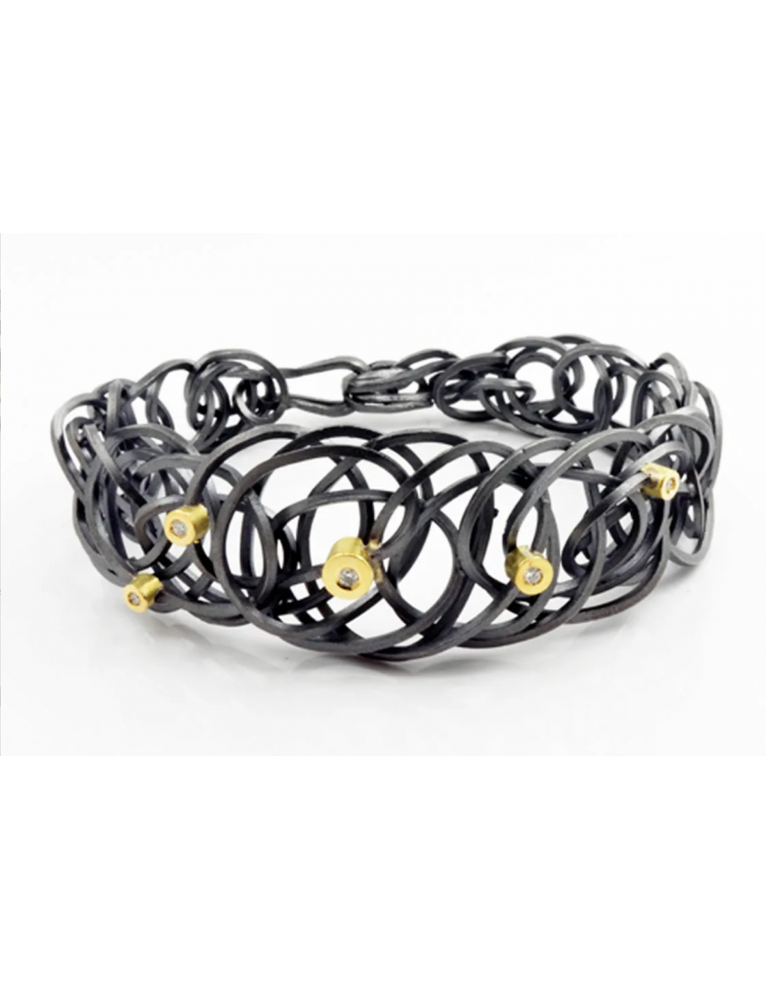 Chaos bracelet, silver and gold with gold thread and 5 diamonds, sterling silver with 18-karat yellow gold wire and TW-VS1 (G) 0.02 ct diamond.