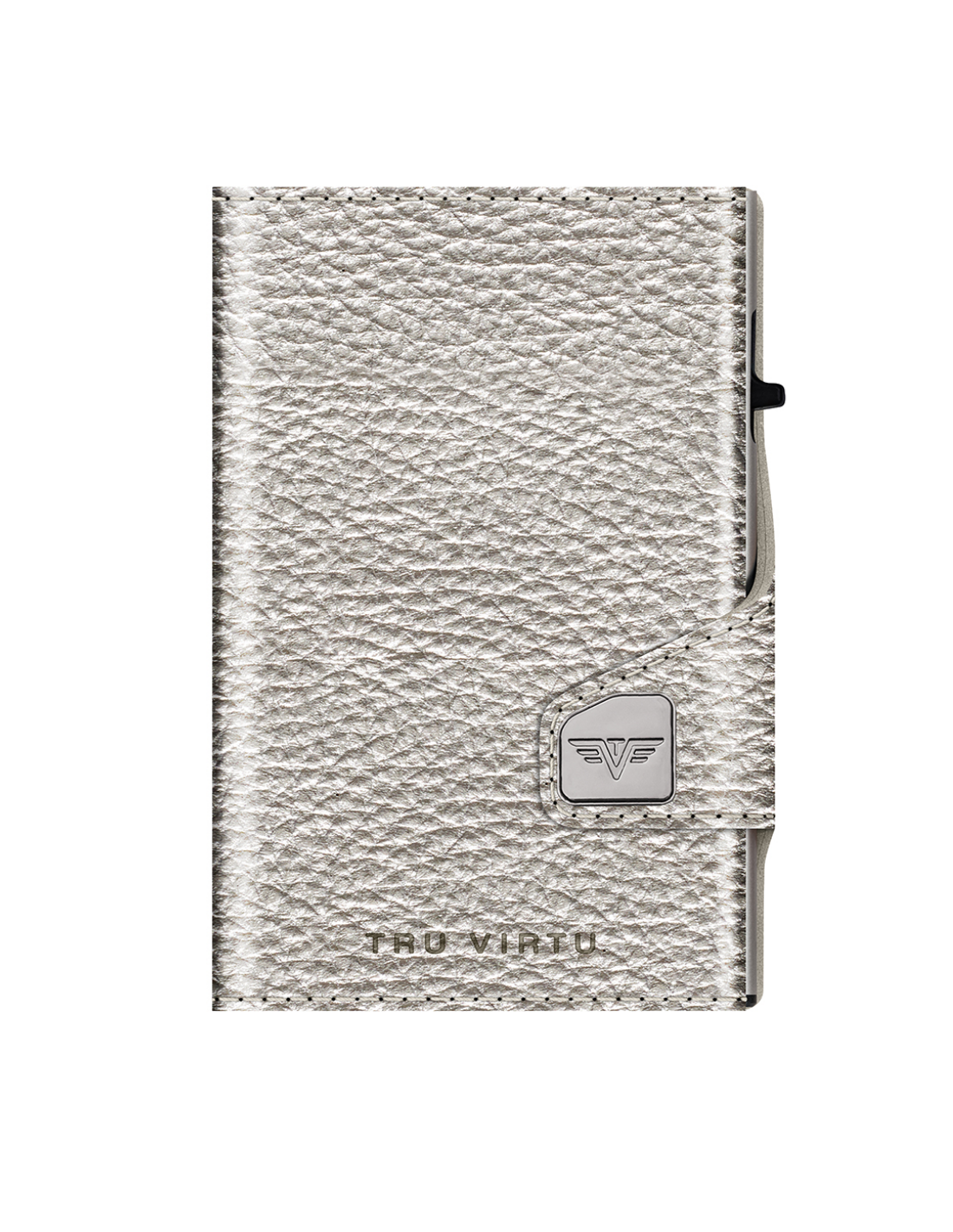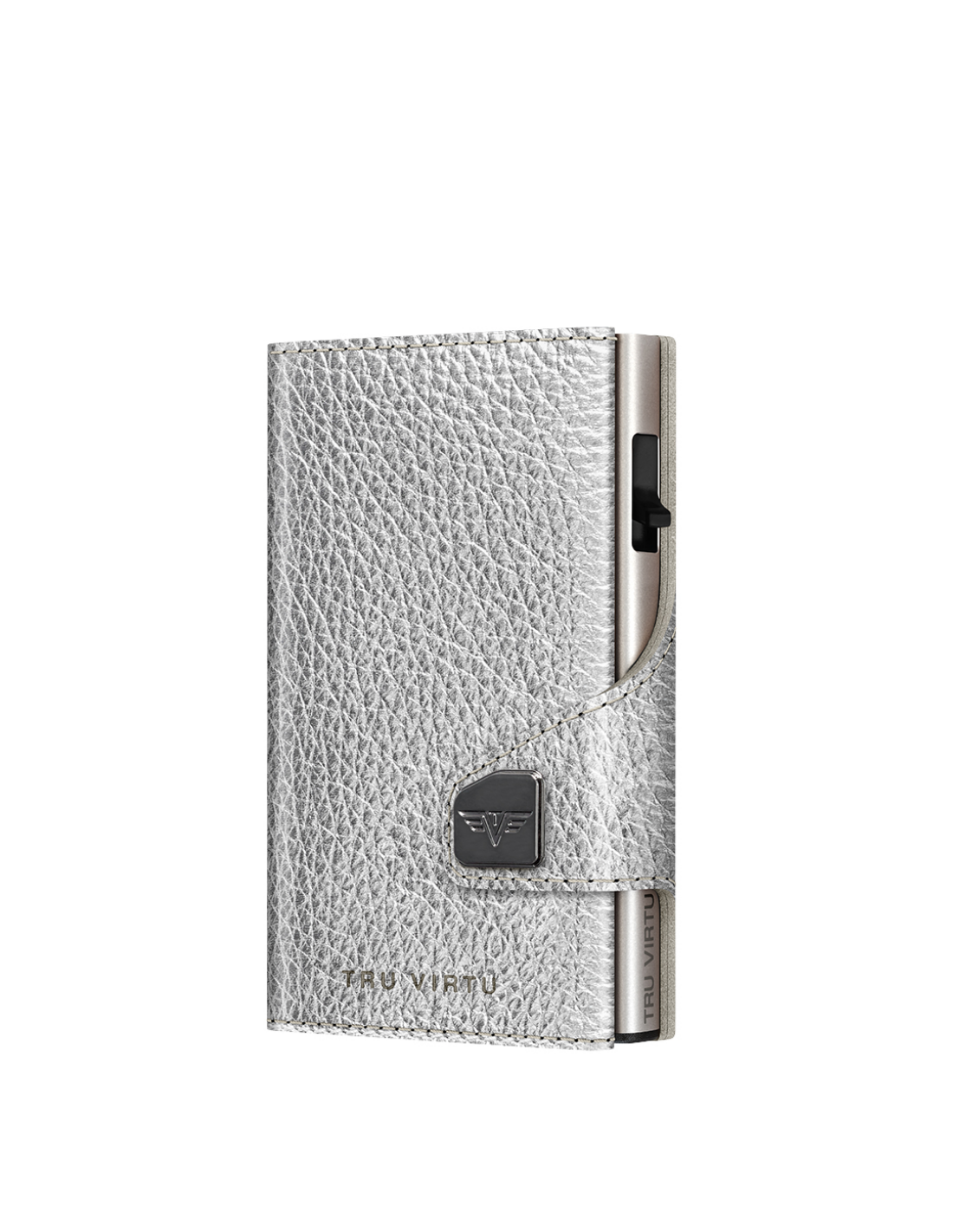 The TRU VIRTU® “CLICK & SLIDE” wallet is the size of a credit card. With a simple touch, and without opening it, up to five cards (a mix of four embossed and one flat) slide automatically into a stacked position. Thanks to the “One-Touch” technology, the “CLICK & SLIDE” wallet can be used with just one hand. The aluminum case inside protects the cards from demagnetization and unauthorized data theft from NFC/RFID chips. The leather cover is made of high-quality Italian leather and provides space for additional credit cards, contactless cards, and banknotes. It is also compatible with “Tap & Go” cards.
