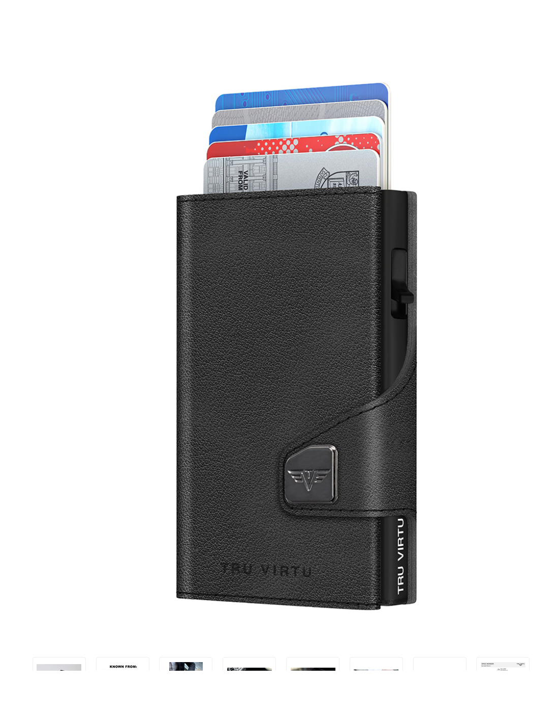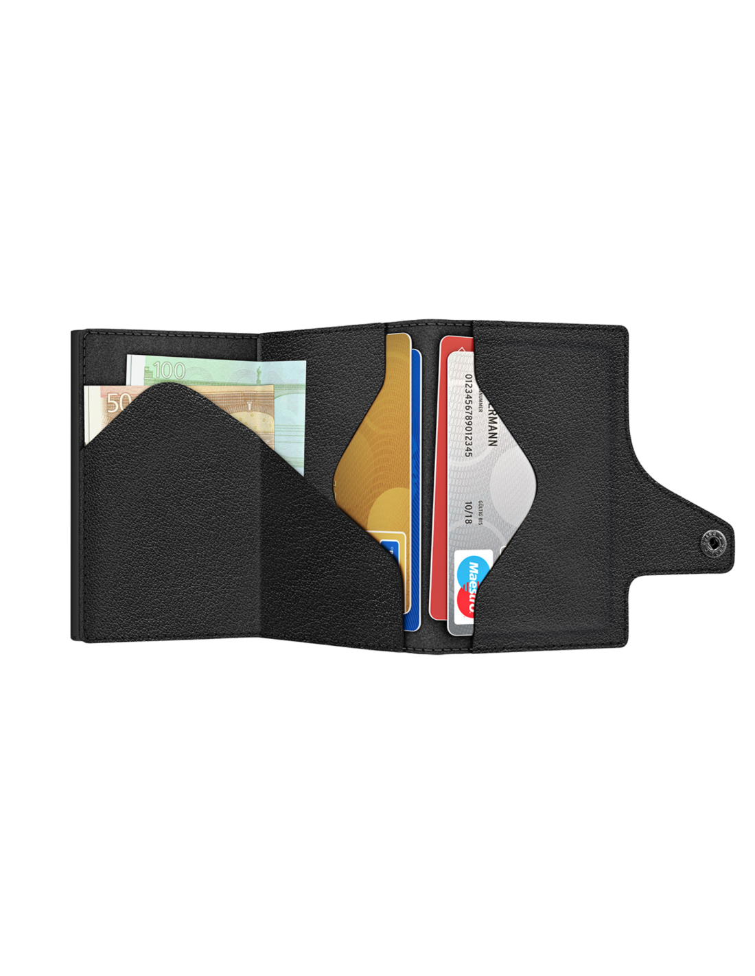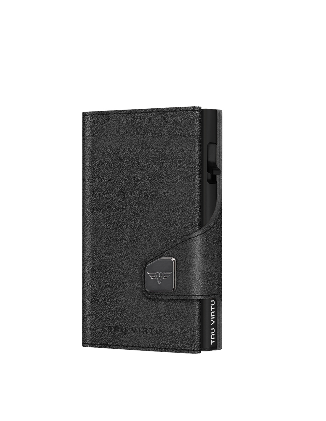 The TRU VIRTU® “CLICK & SLIDE” wallet is the size of a credit card. With a simple touch, and without opening it, up to five cards (a mix of four embossed and one flat) slide automatically into a stacked position. Thanks to the “One-Touch” technology, the “CLICK & SLIDE” wallet can be used with just one hand. The aluminum case inside protects the cards from demagnetization and unauthorized data theft from NFC/RFID chips. The leather cover is made of high-quality Italian leather and provides space for additional credit cards, contactless cards, and banknotes. It is also compatible with “Tap & Go” cards. Made in Germany.