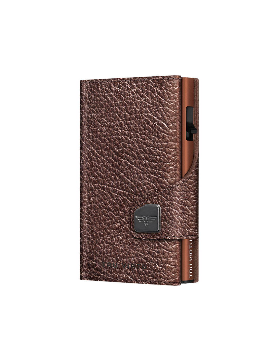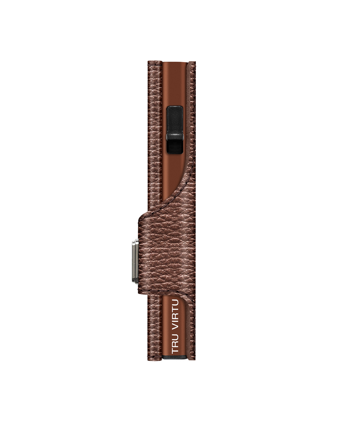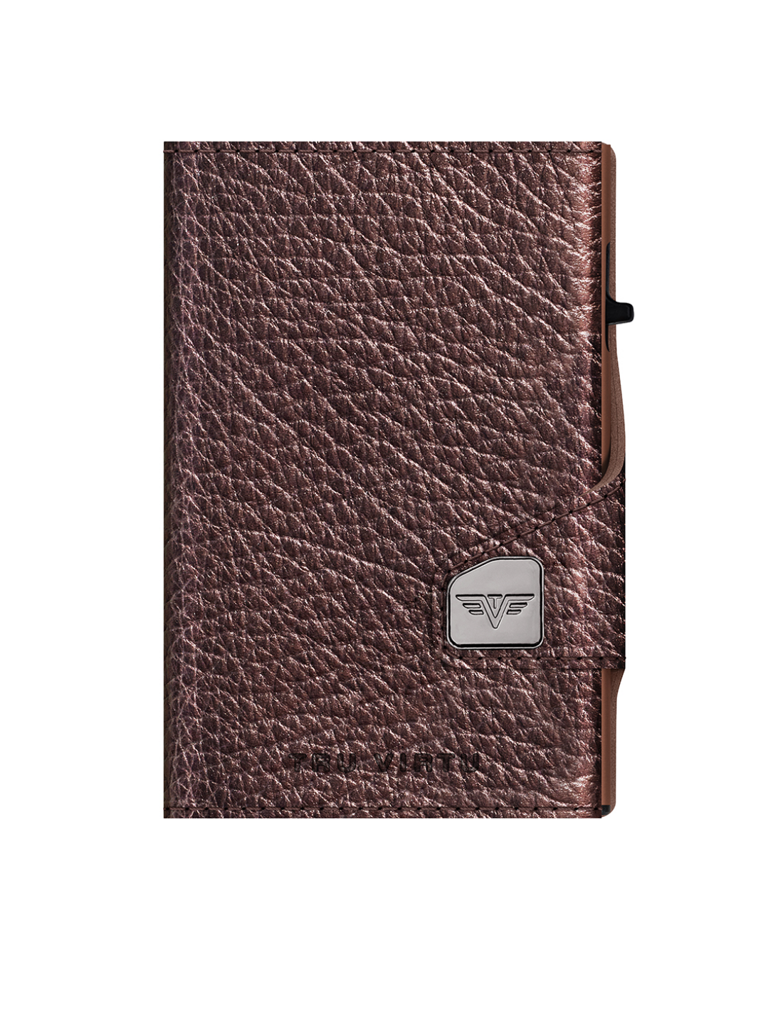 The TRU VIRTU® "CLICK & SLIDE" wallet is the size of a credit card. With a touch, and without having to open it, up to five cards (a mix of four embossed and one flat) automatically slide in, stacked. Thanks to "One-Touch" technology, the "CLICK & SLIDE" wallet can be used with just one hand. The aluminum case inside protects the cards against demagnetization and the illegal theft of data from NFC/RFID chips. This leather wallet is crafted from high-quality Italian leather and offers ample space for credit cards, contactless payments, and banknotes. It is also compatible with Tap & Go cards.