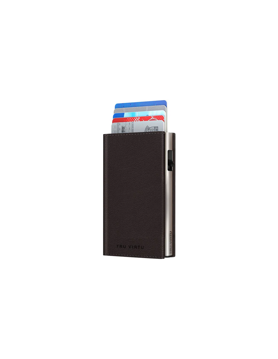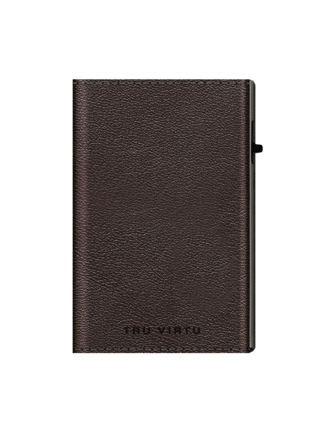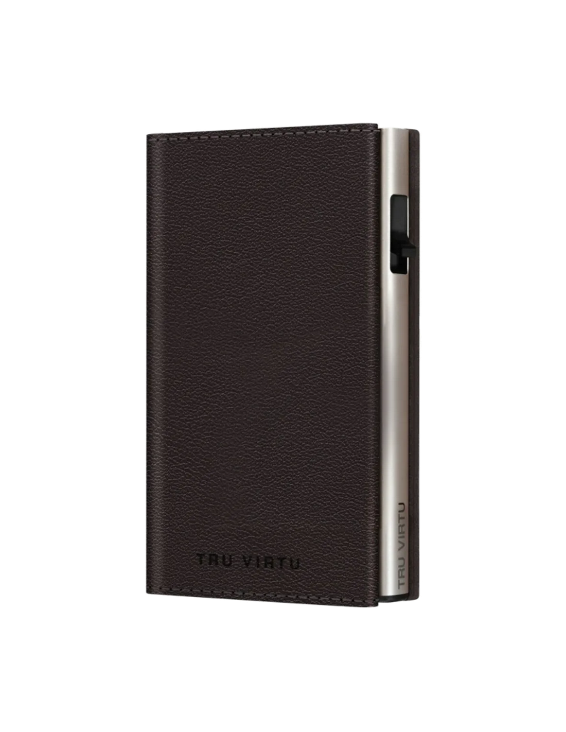 The TRU VIRTU® "CLICK & SLIDE" wallet is the size of a credit card. With a touch, and without having to open it, up to five cards (a mix of four embossed and one flat) automatically slide in, stacked. Thanks to "One-Touch" technology, the "CLICK & SLIDE" wallet can be used with just one hand. The aluminum case inside protects the cards against demagnetization and the illegal theft of data from NFC/RFID chips. This leather wallet is crafted from high-quality Italian leather and offers ample space for credit cards, contactless payments, and banknotes. It is also compatible with Tap & Go cards.