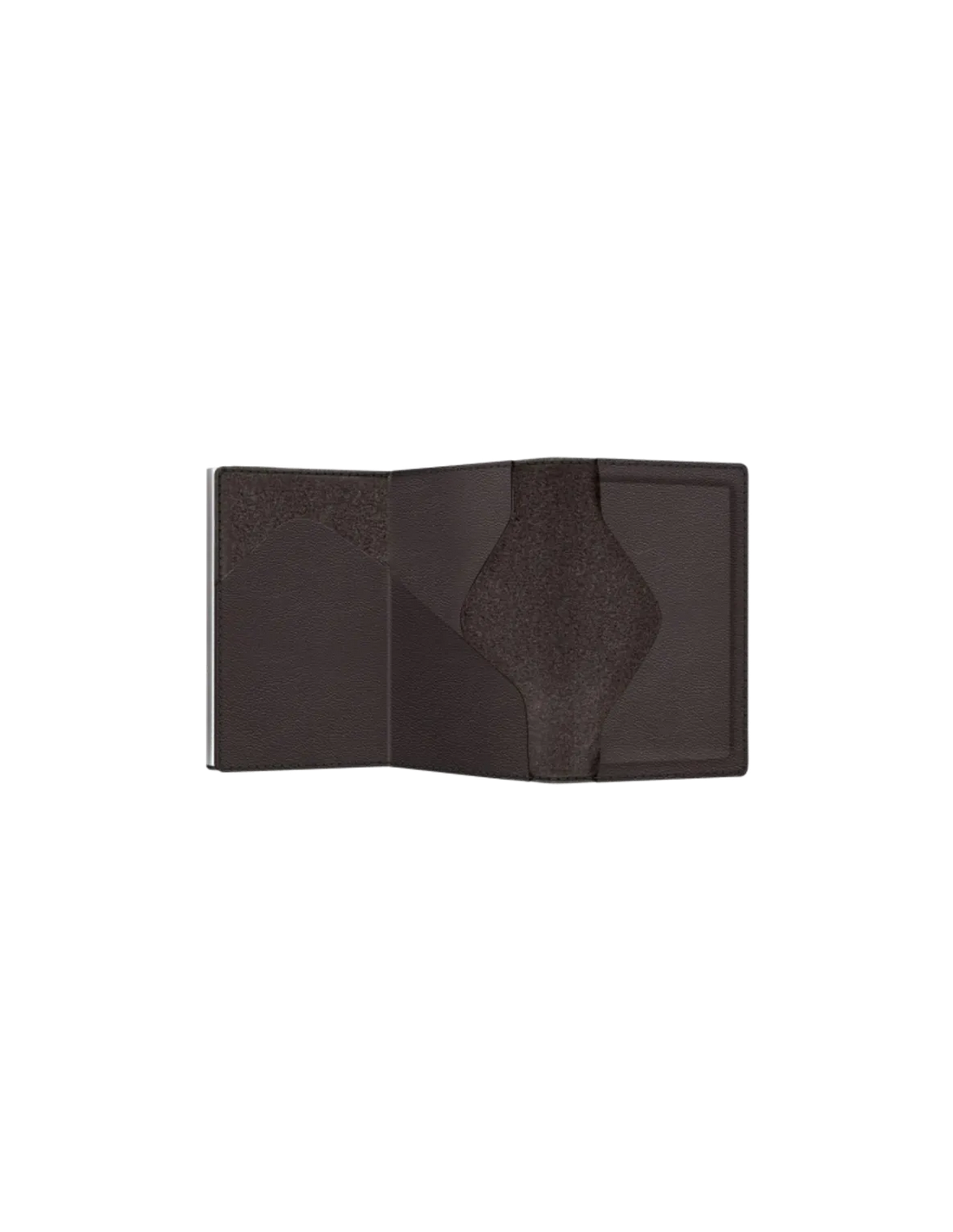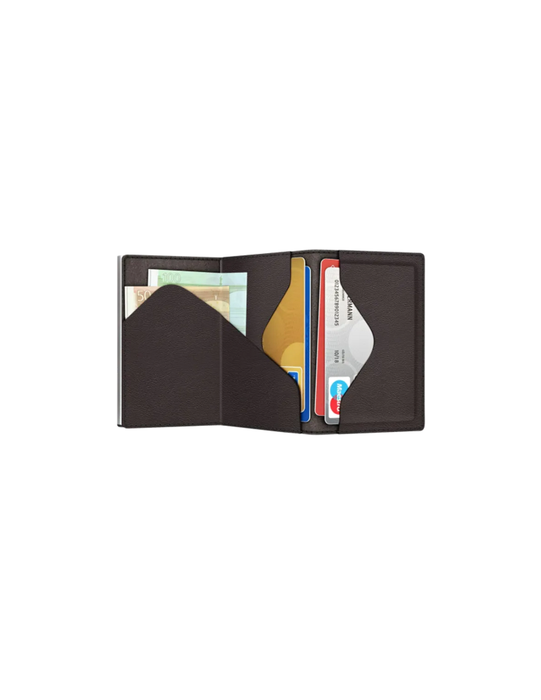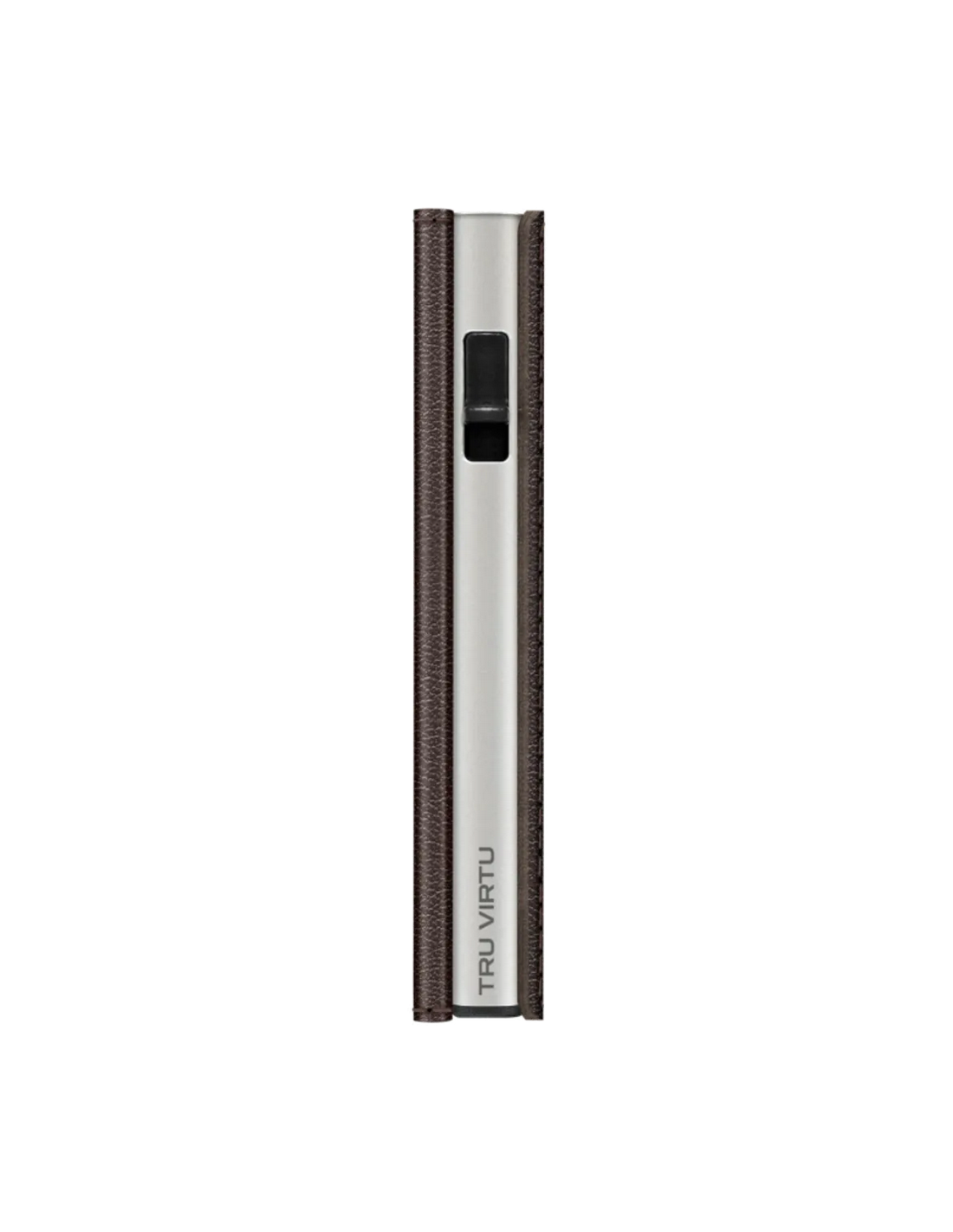 The TRU VIRTU® "CLICK & SLIDE" wallet is the size of a credit card. With a touch, and without having to open it, up to five cards (a mix of four embossed and one flat) automatically slide in, stacked. Thanks to "One-Touch" technology, the "CLICK & SLIDE" wallet can be used with just one hand. The aluminum case inside protects the cards against demagnetization and the illegal theft of data from NFC/RFID chips. This leather wallet is crafted from high-quality Italian leather and offers ample space for credit cards, contactless payments, and banknotes. It is also compatible with Tap & Go cards.
