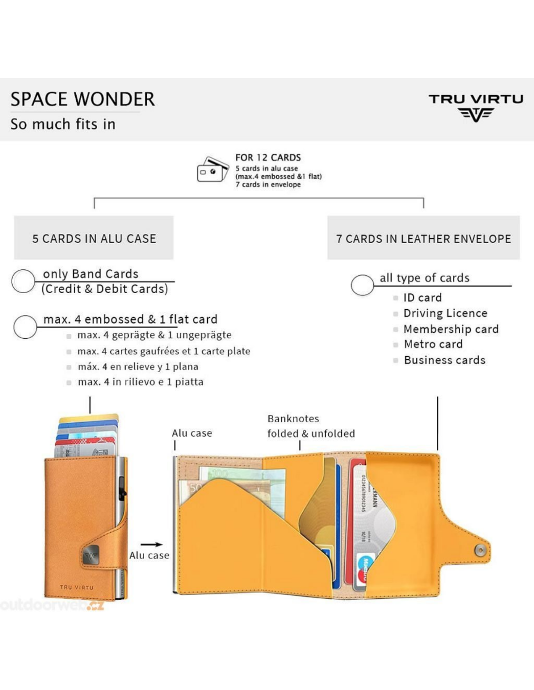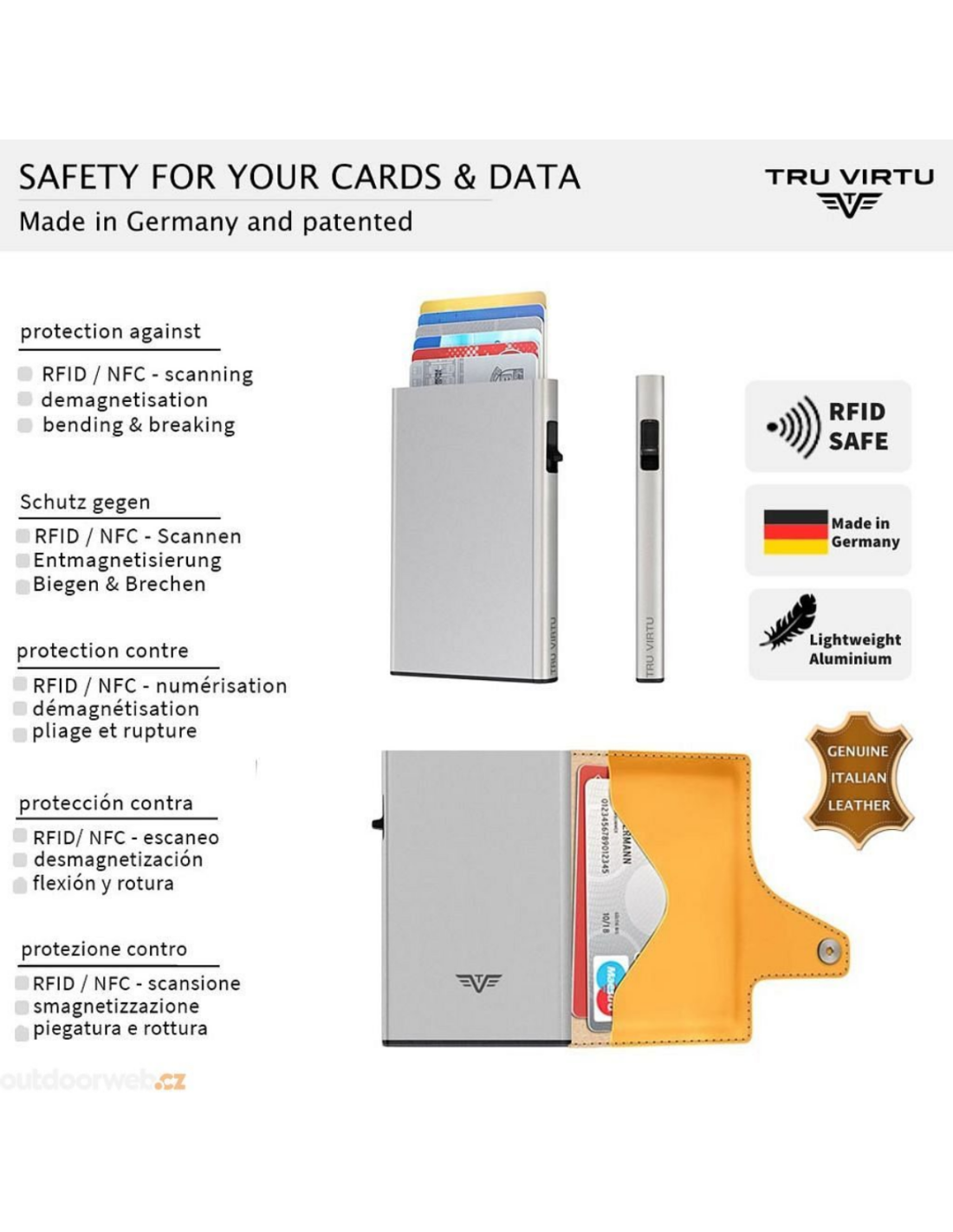 At the touch of a finger and without opening it, a maximum of 5 bank cards (mix of max. 4 embossed and 1 plain card) automatically slide out in a staggered manner. The clever "One-Touch" technology makes the "CLICK & SLIDE" easy to use with just one hand. The inner aluminium case protects your cards against illegal data theft from NFC/RFID chips and demagnetisation. The leather cover made of vegan apple leather offers additional space for more cards, business cards and banknotes and has the added advantage of allowing "Tap & Go" cards to be used conveniently. Made in Germany.