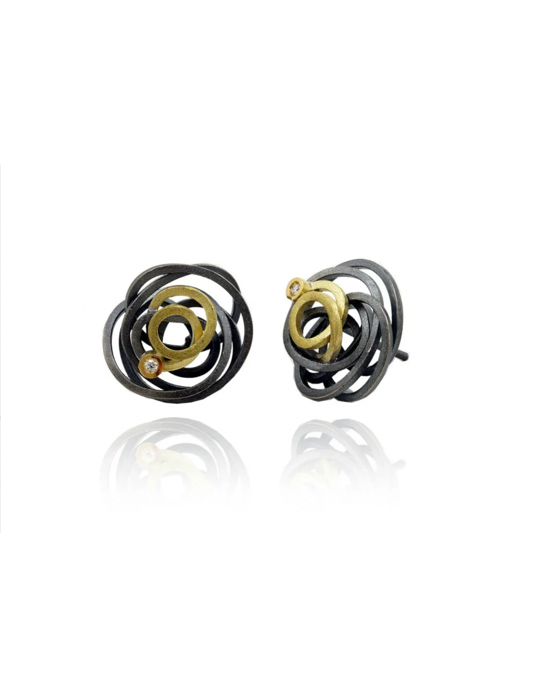 Large "Chaos" earrings, sterling silver with 18-karat yellow gold wire and 0.02 ct TW-VS1 (G) diamonds, handmade by the artisan, each one unique.