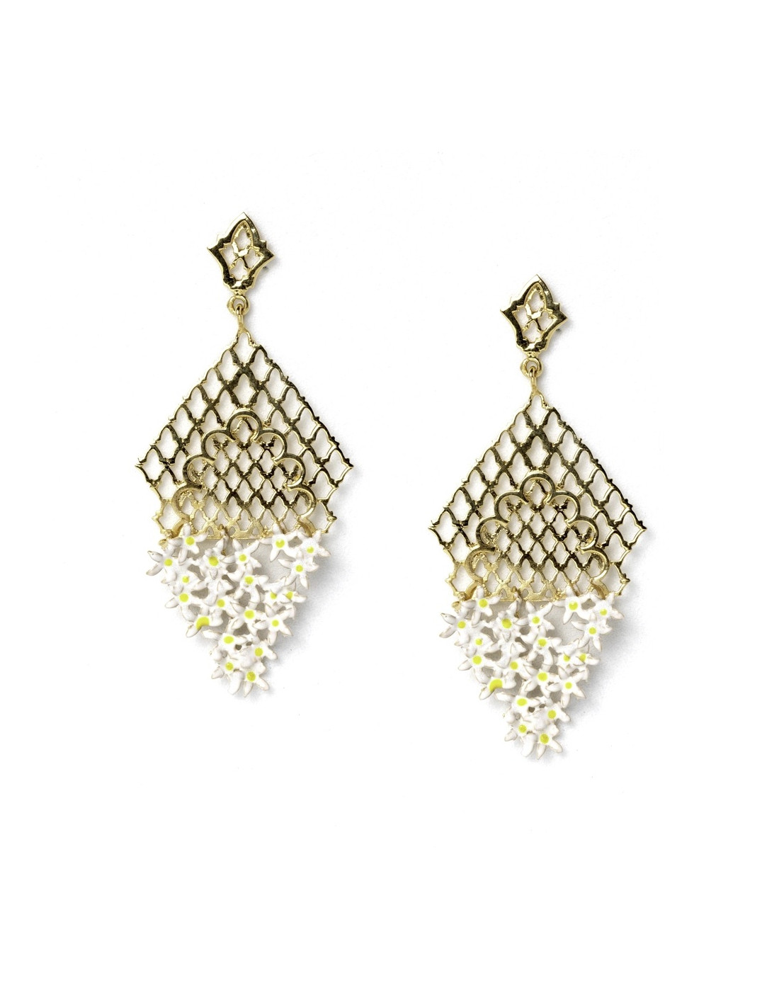 These stunning earrings from the Sinagoga Collection feature an intricate lattice design in gold-toned metal, reminiscent of architectural details. They showcase a vibrant blue element, possibly enamel or stone, adding a striking pop of color. The elegant combination of the metallic openwork and the rich blue creates a sophisticated and timeless accessory.