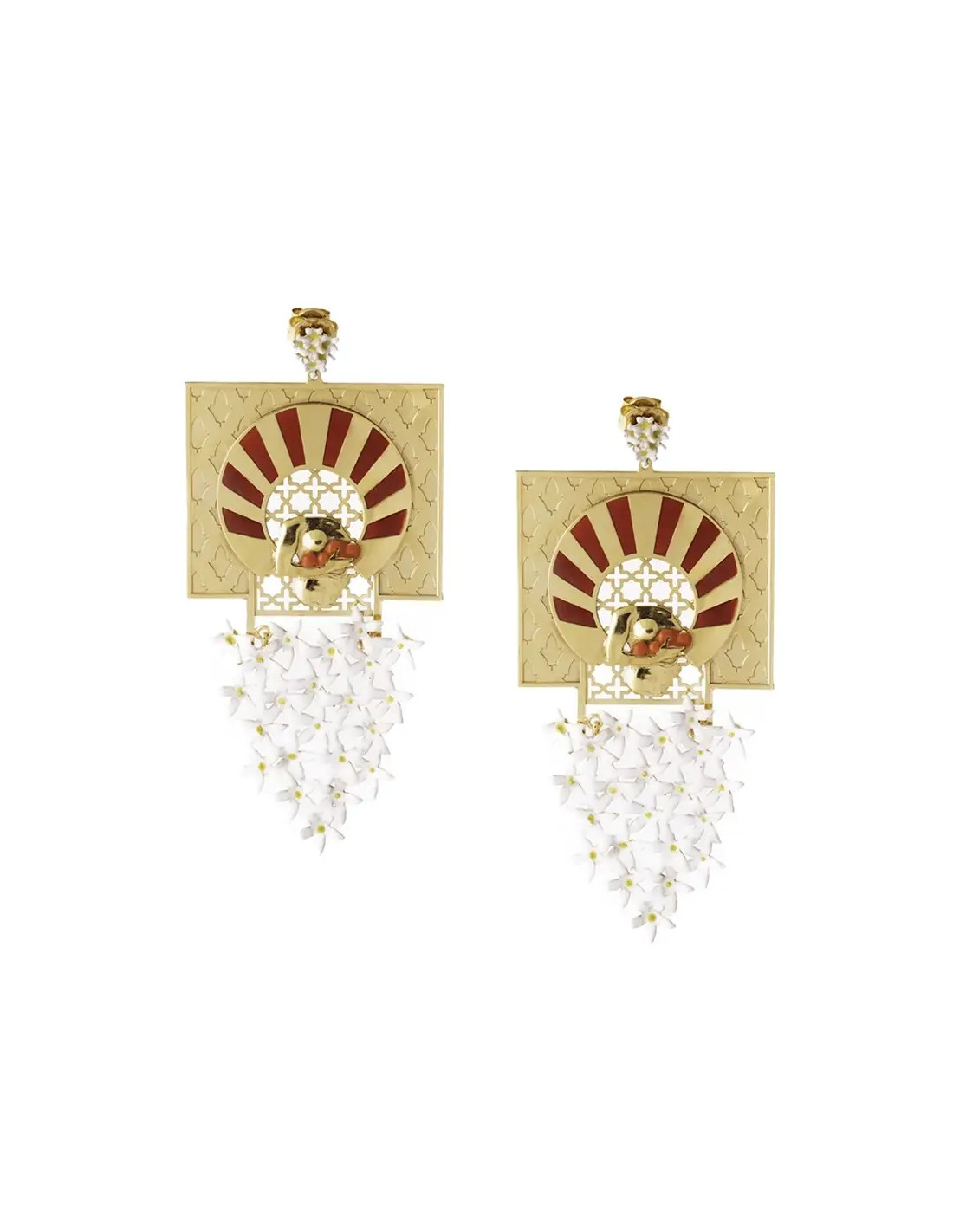 These breathtaking earrings are a magnificent fusion of architectural grandeur and delicate natural beauty, evoking the splendor of Medina Azahara with a vibrant, modern twist. Each earring features a prominent square top crafted from a rich gold-toned metal, with a textured or subtly patterned surface that adds depth.
