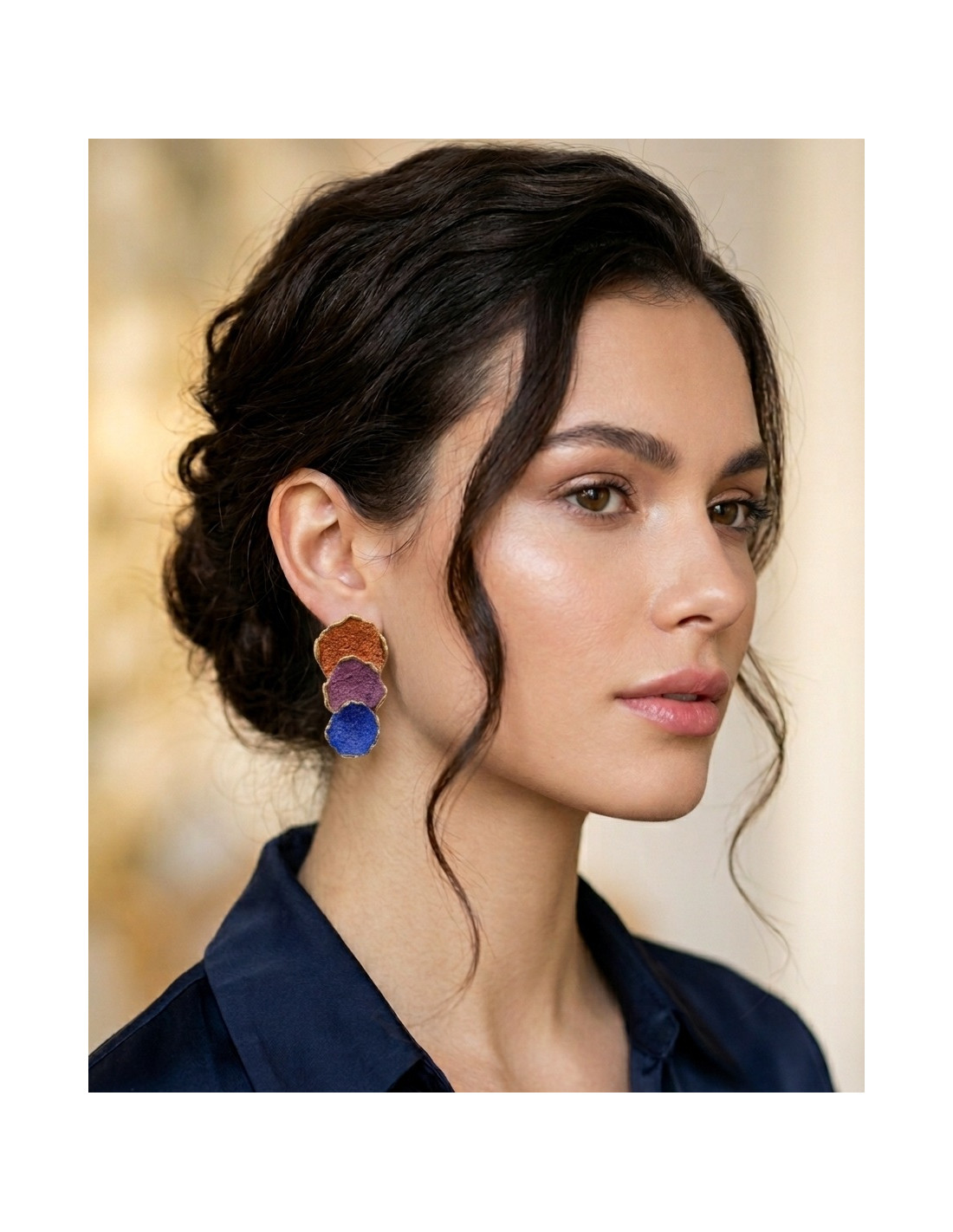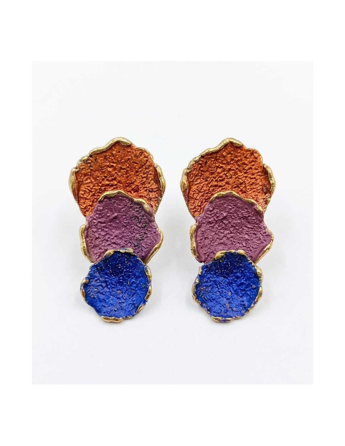 Atlas brass earrings with gold plating and enamel in shades of diferent colors.
