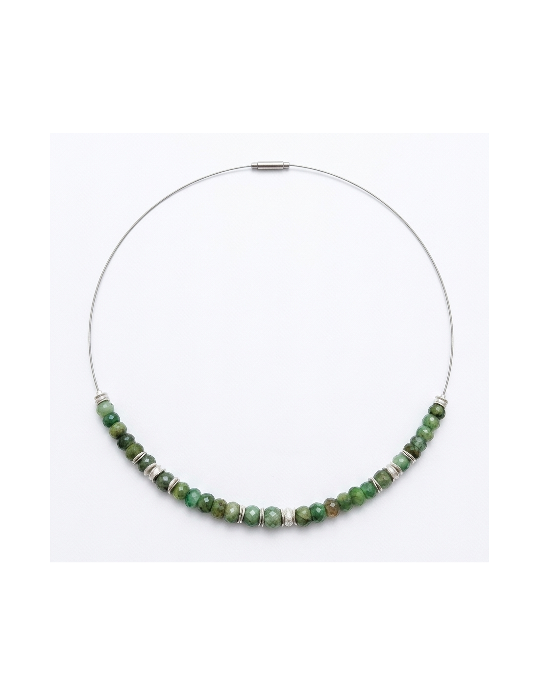 A necklace born in the heart of India. "Maharani Verde" is composed of faceted emeralds brought from India, carefully selected for their intensity and depth of color. Each facet captures the light and transforms it into vibrant sparkles, evoking exotic gardens and ancient palaces. The delicately crafted silver adds balance and purity, enhancing the emerald's natural strength without overshadowing it. A sophisticated and timeless piece with character, designed for women who value the story behind each jewel and the authentic beauty of natural stones.