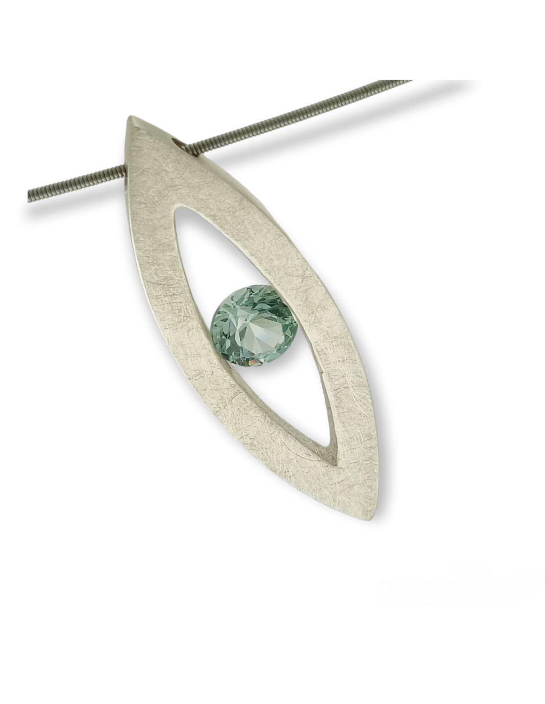 Pendant silver lei with striped matte finish and spinel stone bright crysolite color 6 m.m. tension setting. Includes 42 cms steel cable with bayonet closure.