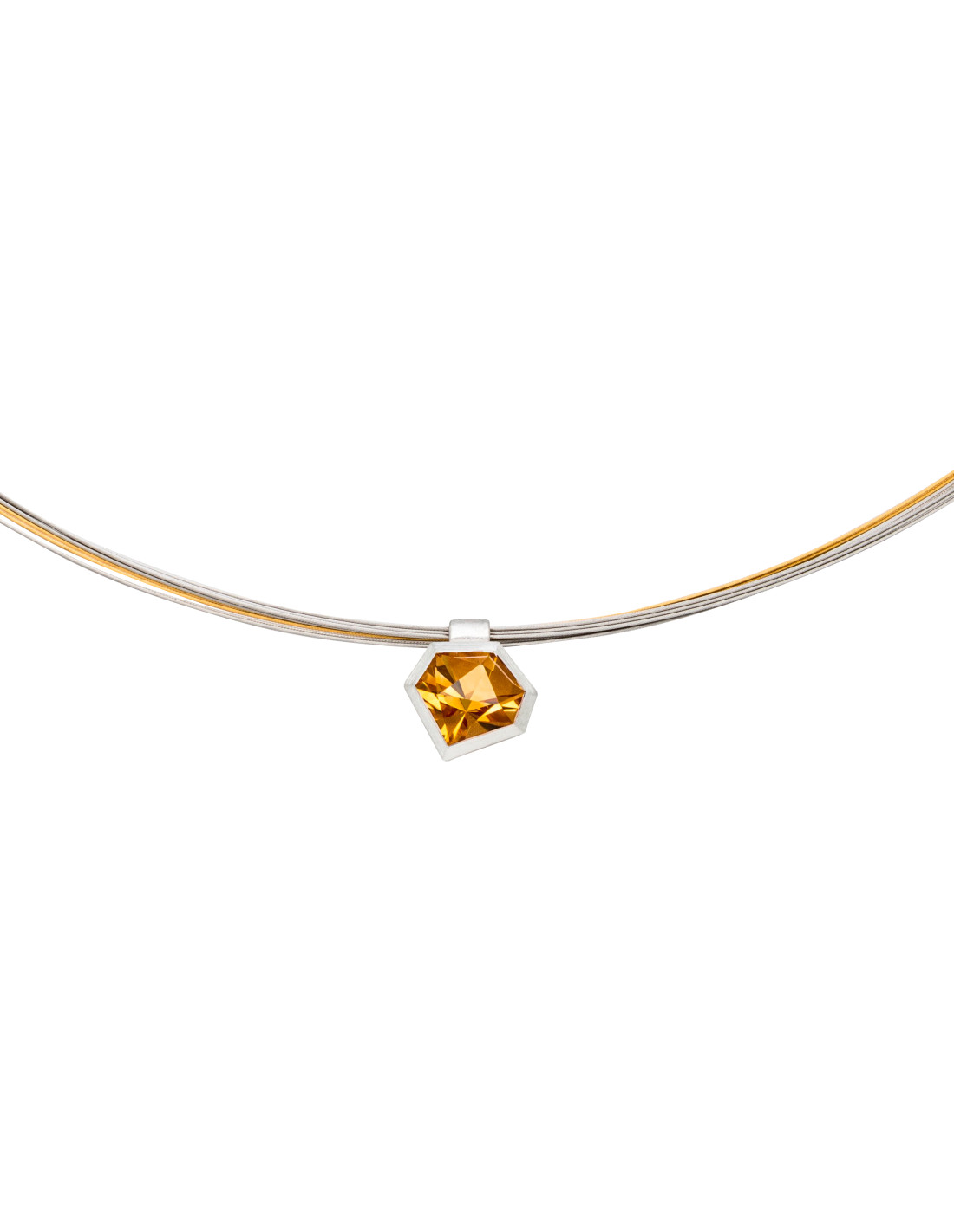 Silver pendant with fantasy-cut citrine stone, two-tone steel cable, and bayonet clasp.