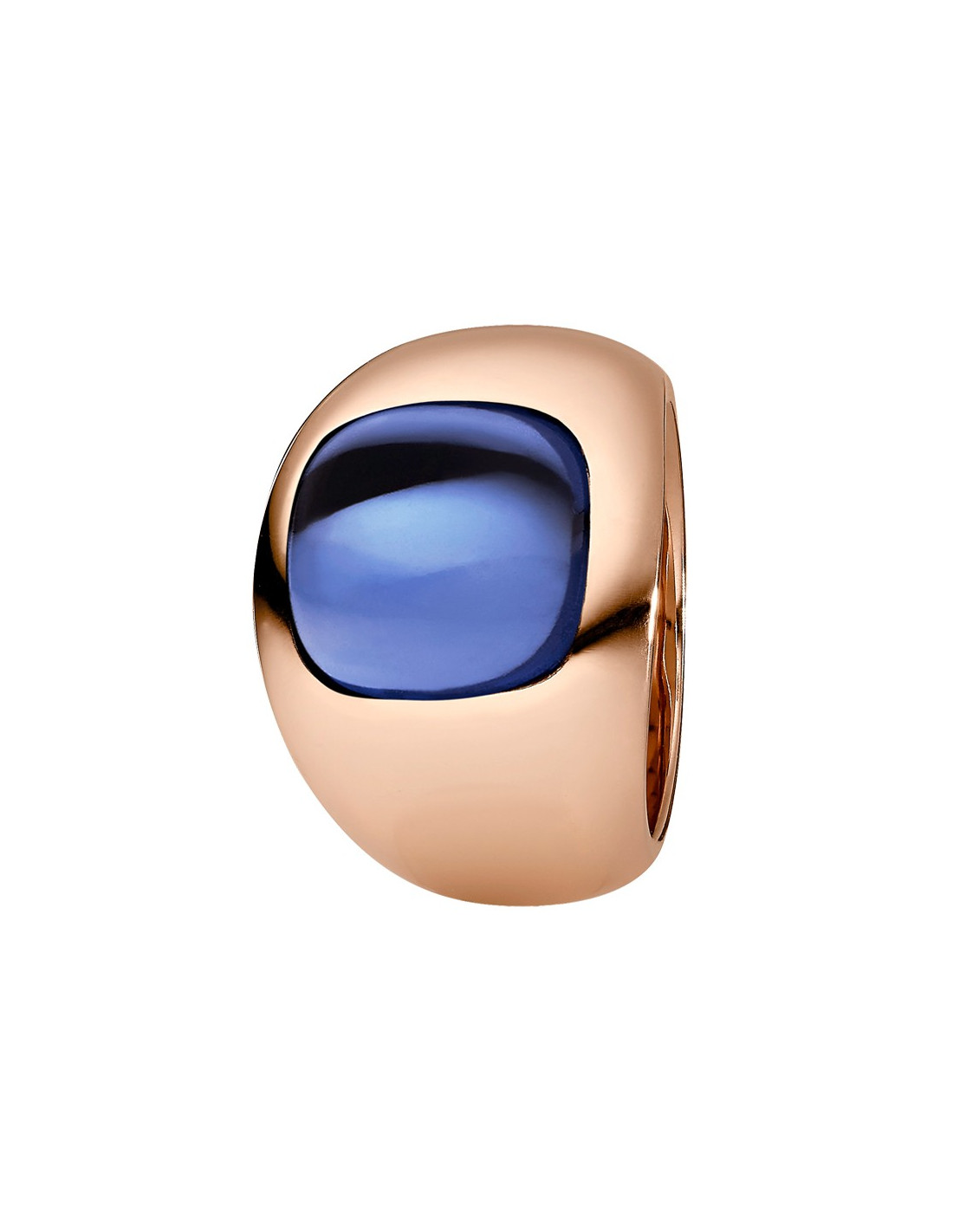 This stunning ring in polished, rose gold coloured stainless steel has an extraordinary impact. The wide circular band and the striking blue hydrothermal quartz are distinctive features that leave a lasting impression.