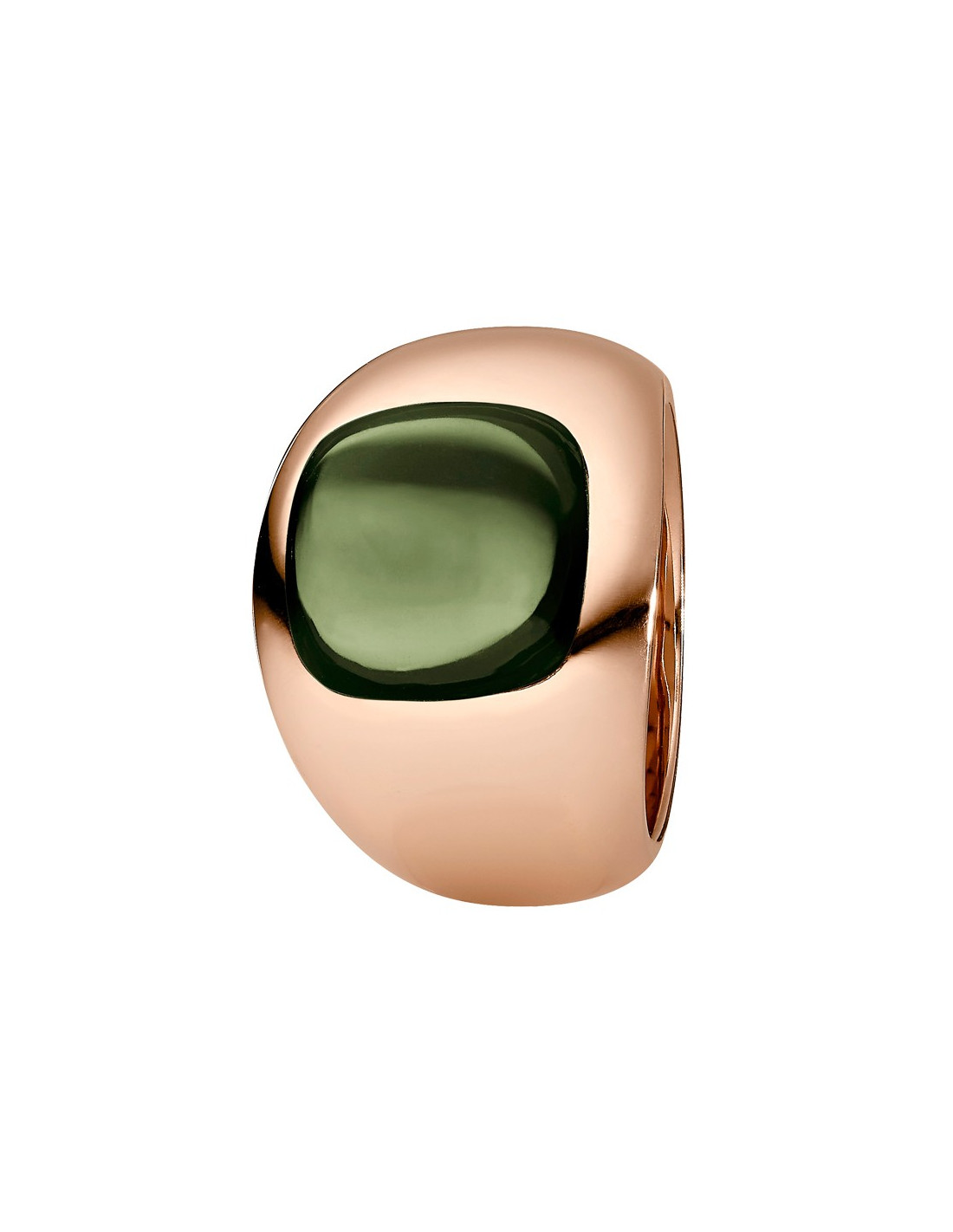 This stunning ring in polished, rose gold coloured stainless steel has an extraordinary impact. The wide circular band and the striking blue hydrothermal quartz are distinctive features that leave a lasting impression.