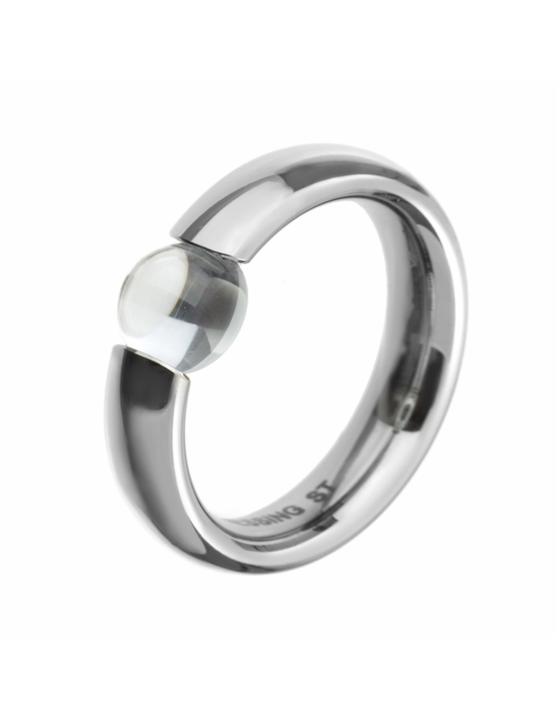 Anillo de acero pulido con piedra cabuchón corindón color aguamarina