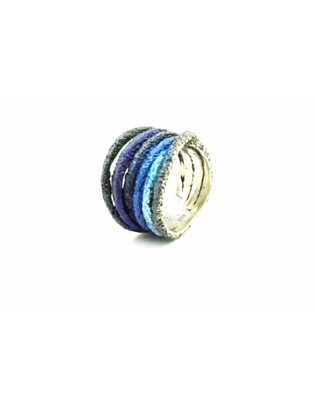 Anillo realizado en plata de ley 925 con acabados oxidado y esmalte en colores azules dando un toque muy original a un diseño totalmente artesanal