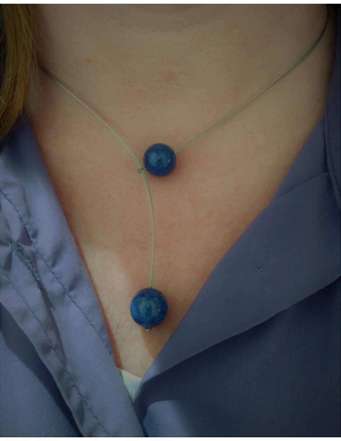 Colgante con cable de acero y bolas de piedra natural agatha azul, producto realizado en nuestro taller de forma artesanal.