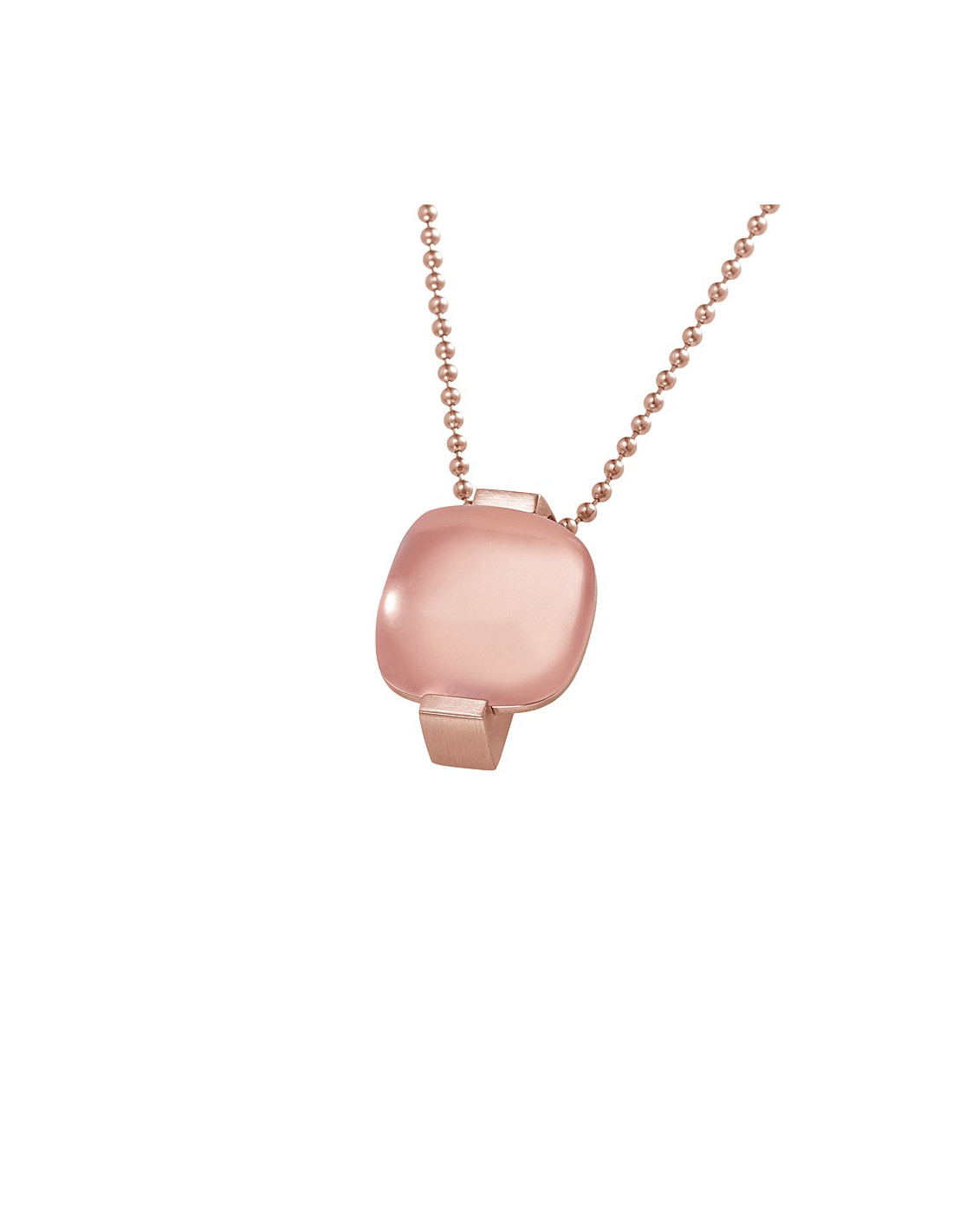 Este colgante en acero inoxidable tiene un impacto extraordinario. El diseño sencillo y el sorprendente cuarzo rosa son rasgos distintivos que dejan una impresión duradera.