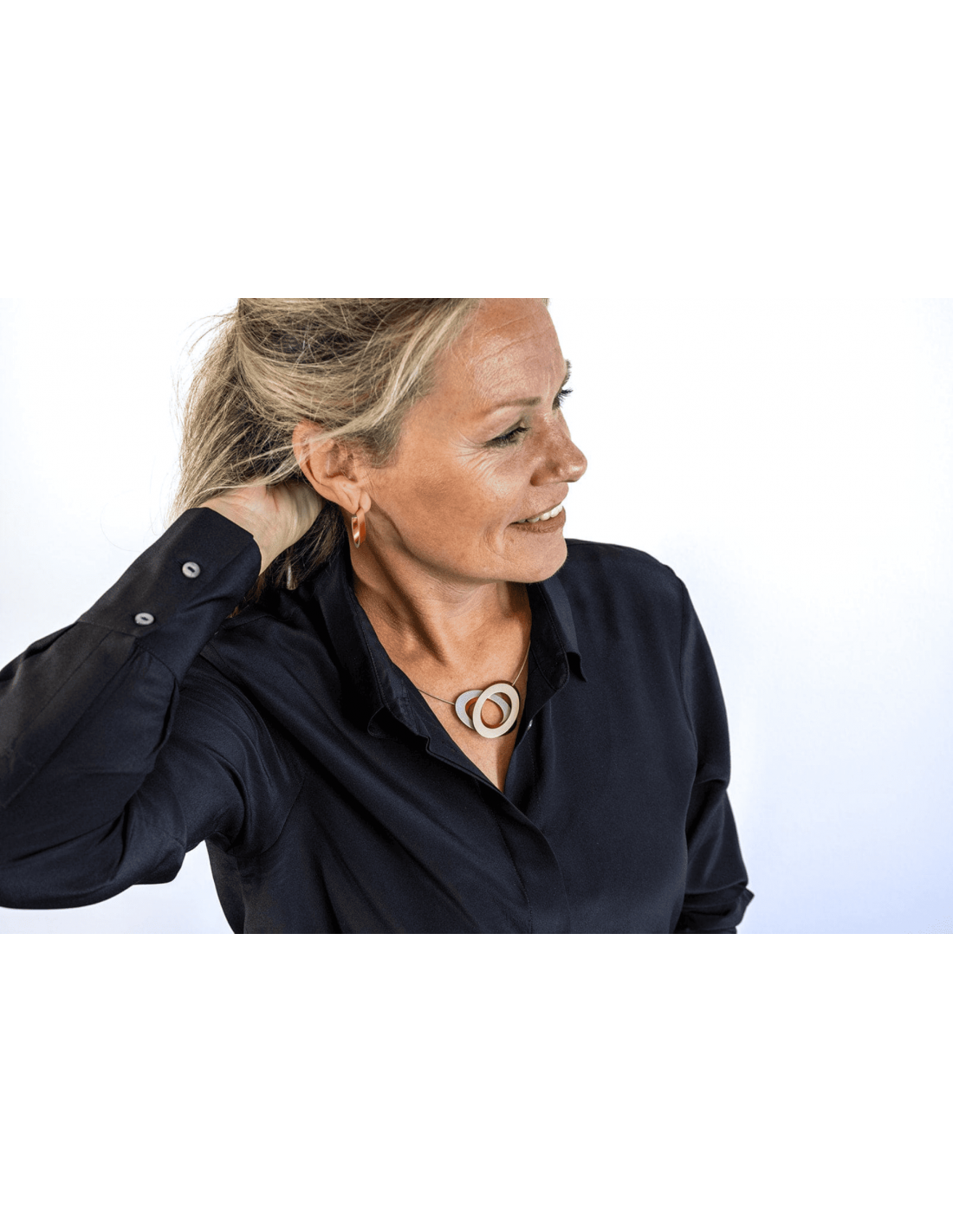 Diseño atemporal, único y a la vez sutil. Un collar especial de dos óvalos con un cierre magnético. Estos imanes se atraen y, con un clic, el collar se cierra. Se abre separando las dos partes ovaladas. Nuestros exclusivos pendientes ovalados OLIVIA también combinan a la perfección.