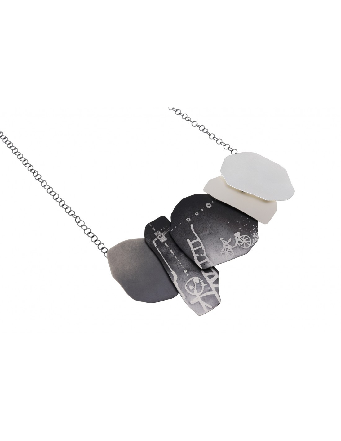 Collar Monotype de estilo contemporaneo de plata de ley combinada en blanco, oxidada y imagen.