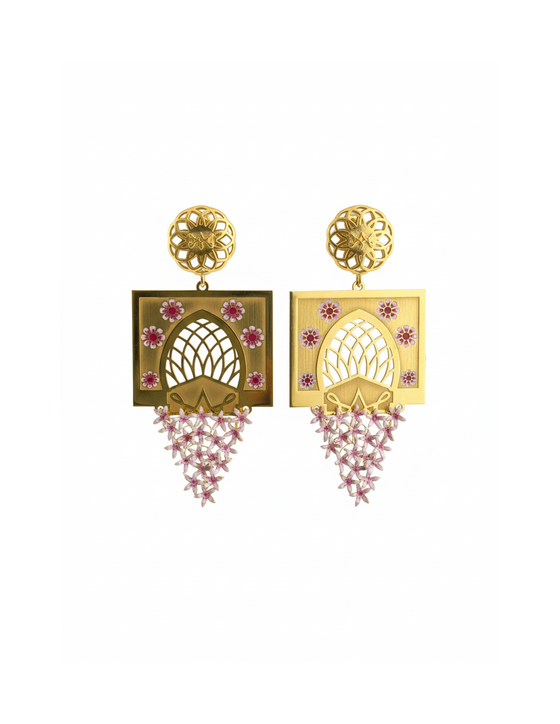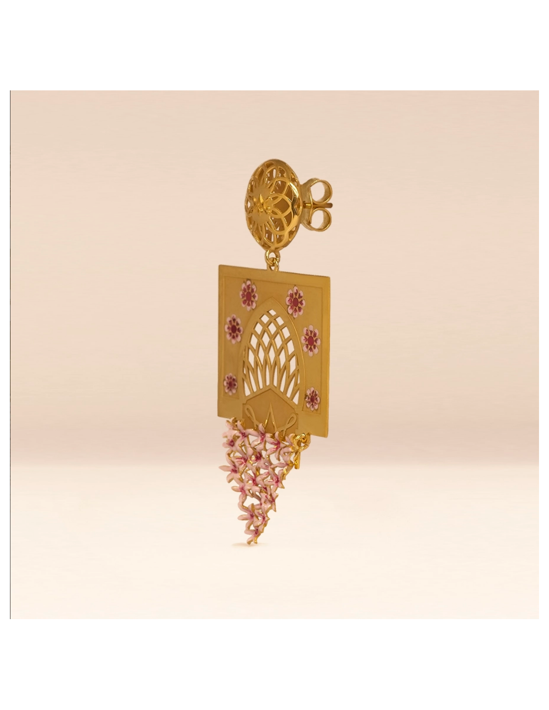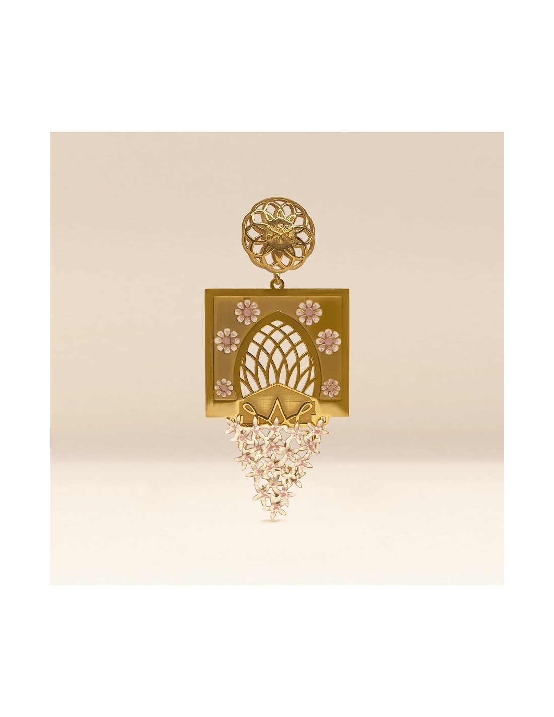 Cada pendiente comienza con un cautivador botón chapado en oro con una roseta calada que evoca los intrincados patrones de sebka . Debajo, suspendido con elegancia, se encuentra un distintivo marco en forma de arco que evoca una ventana o un arco ciego típico de la arquitectura cordobesa.
