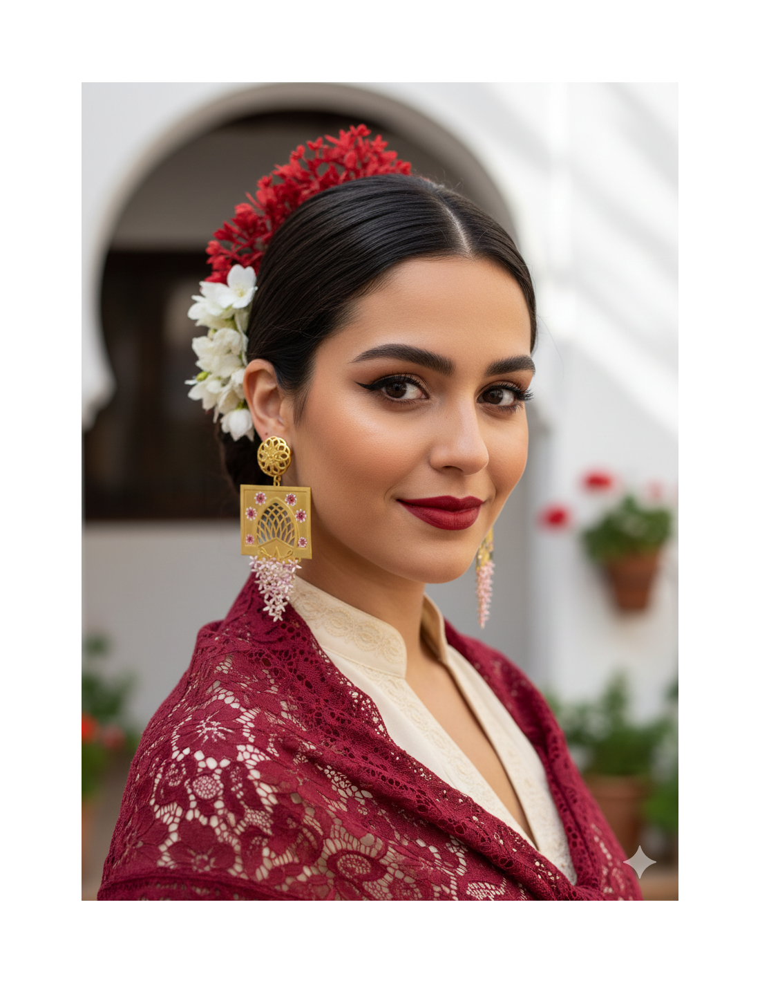 Los pendientes «Arco Floral de Córdoba» se inspiran en la legendaria ciudad de Córdoba, evocando el arte mudéjar presente en sus antiguos patios, techos detallados y la icónica Mezquita-Catedral. Estos impresionantes pendientes colgantes combinan con maestría la fuerza de la arquitectura geométrica con la delicadeza de la naturaleza floreciente. Son una elección exquisita para quienes aprecian la joyería de diseño con raíces en la historia andaluza.