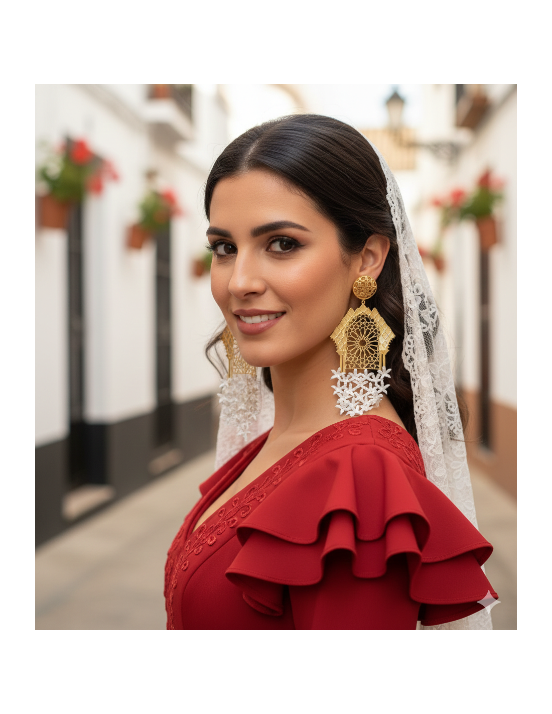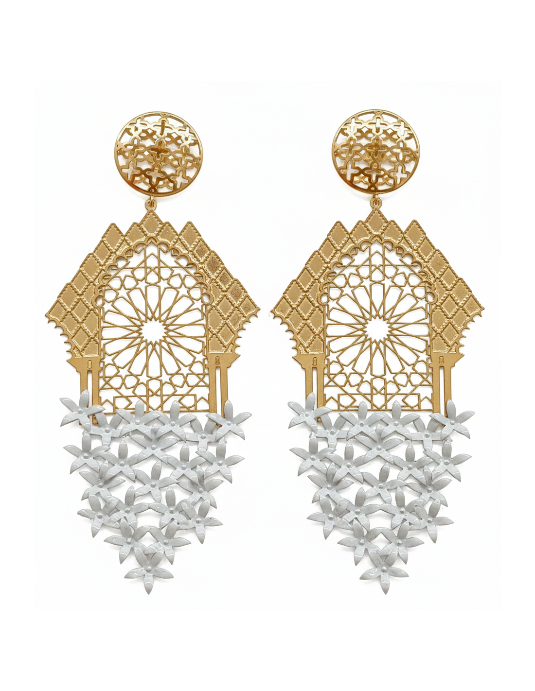 Cada pendiente comienza con un cautivador botón chapado en oro con una roseta calada que evoca los intrincados patrones de sebka . Debajo, suspendido con elegancia, se encuentra un distintivo marco en forma de arco que evoca una ventana o un arco ciego típico de la arquitectura cordobesa.